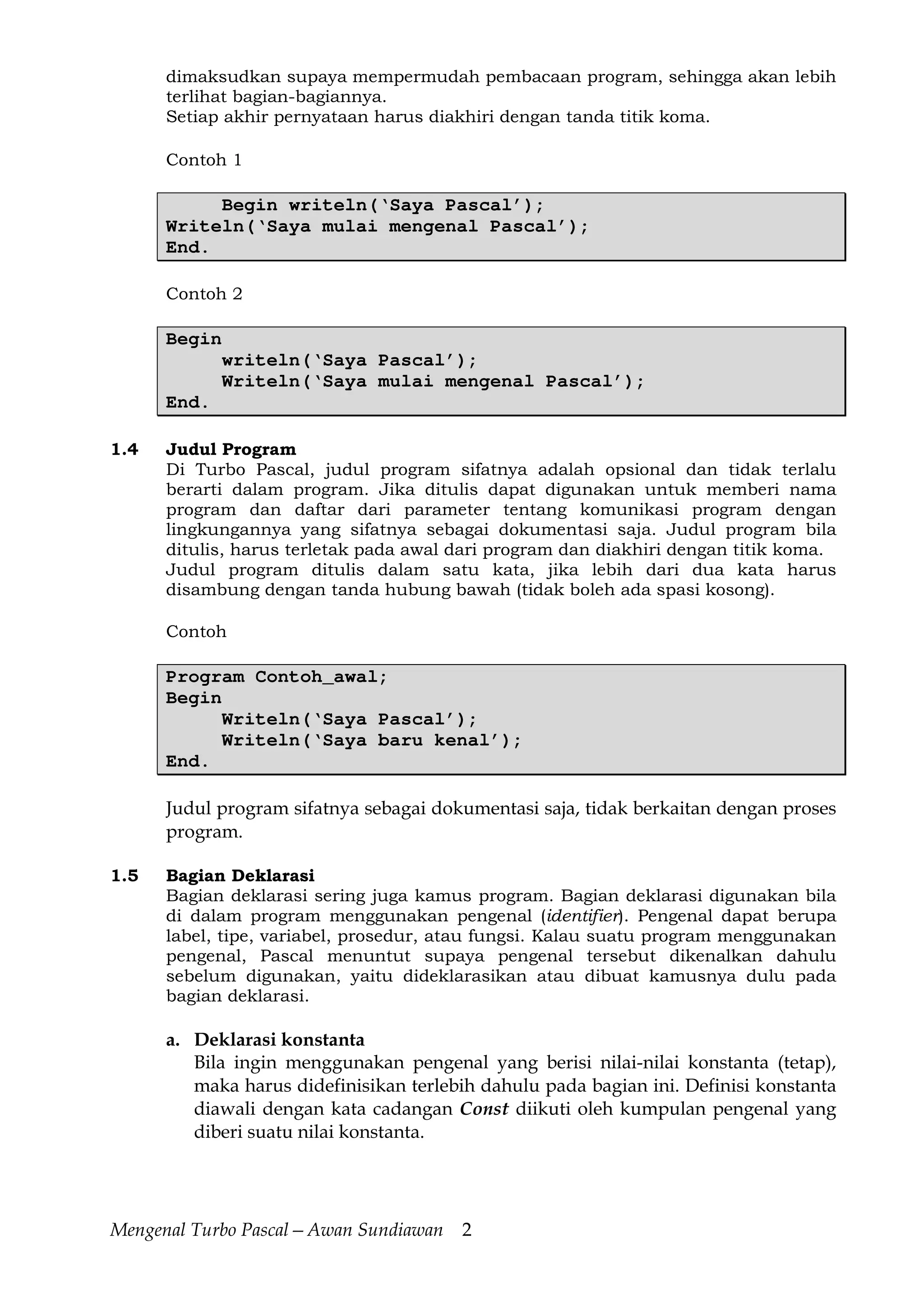 Program ini membahas tentang struktur program Pascal dan elemen-elemennya. Secara ringkas, program Pascal terdiri dari judul, bagian deklarasi, dan bagian pernyataan. Bagian deklarasi berisi deklarasi konstanta, variabel, prosedur, dan fungsi. Sedangkan bagian pernyataan berisi instruksi yang akan dijalankan program. Elemen utama program Pascal antara lain simbol dasar, kata kunci, pengenal, tipe data, operator, komentar, dan pernyataan