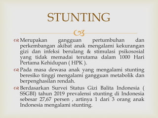 Dokumen ini membahas tentang stunting, gangguan pertumbuhan pada anak akibat kekurangan gizi dan infeksi yang berulang, dengan prevalensi di Indonesia mencapai 27,67% pada tahun 2019. Untuk mengatasi masalah ini, Presiden mengeluarkan Peraturan Nomor 72 Tahun 2021 yang menargetkan penurunan stunting hingga 14% pada tahun 2024 melalui program 'Dapur Sehat Atasi Stunting' (DASHAT), yang fokus pada pemberdayaan masyarakat dan pemenuhan gizi seimbang bagi keluarga berisiko stunting. Program ini melibatkan kolaborasi antara pemerintah, masyarakat, dan sektor swasta untuk memastikan keberlangsungan dan keberhasilan upaya pencegahan stunting.