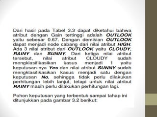 Algoritma C4.5 adalah algoritma klasifikasi data mining yang merupakan pengembangan dari algoritma ID3. C4.5 mampu menangani atribut kosong dengan mengisi nilai berdasarkan nilai dominan, dan memilih atribut akar berdasarkan nilai gain tertinggi yang dihitung menggunakan rumus entropy. Studi kasus mendemonstrasikan pembentukan pohon keputusan C4.5 untuk klasifikasi data.