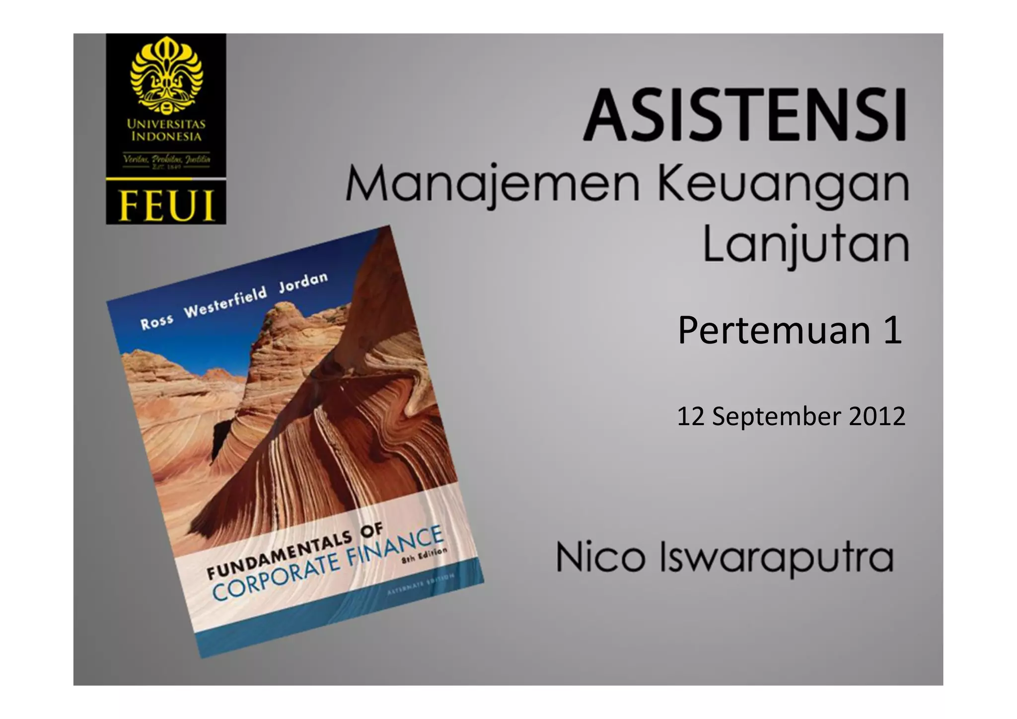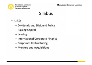 This document outlines the topics that will be covered in an Advanced Financial Management course. The course will include 14 lectures from the professor and 12 meetings with assistants. There will be a midterm exam covering discounted cash flow valuation, capital investment decisions, capital budgeting, and cost of capital. The final exam will cover dividends and policy, raising capital, leasing, international finance, and mergers and acquisitions. Key concepts that will be discussed include the three areas of financial management, net present value calculations, weighted average cost of capital, free cash flows, and the time value of money.