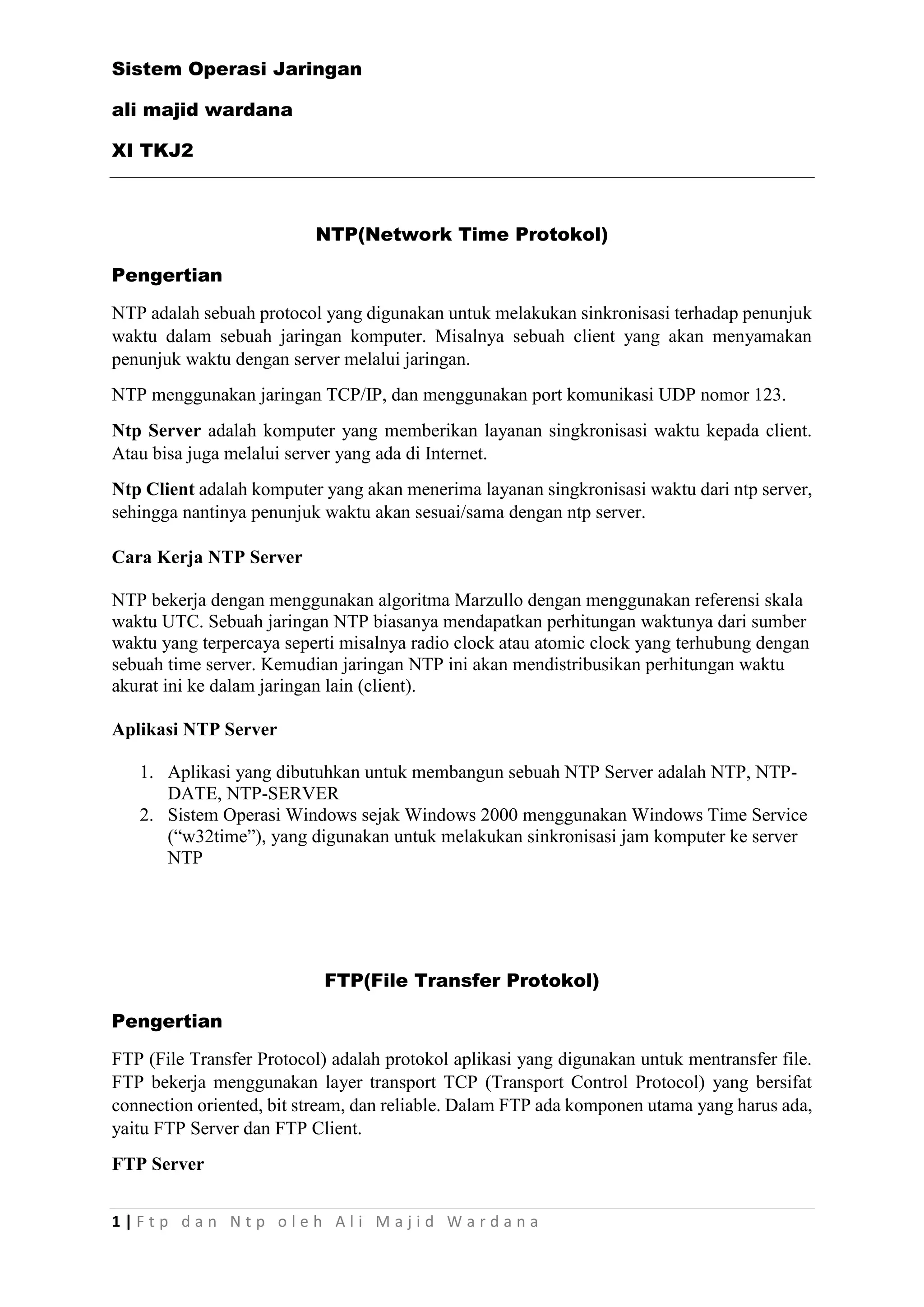 Dokumen ini menjelaskan tentang dua protokol penting dalam jaringan, yaitu NTP (Network Time Protocol) untuk sinkronisasi waktu dan FTP (File Transfer Protocol) untuk mentransfer file. NTP menggunakan algoritma Marzullo dan referensi waktu dari sumber terpercaya untuk menjaga kesamaan waktu antar perangkat, sementara FTP memungkinkan pengguna untuk meng-upload dan men-download file antar komputer dengan menggunakan koneksi TCP. Meskipun FTP cepat dan andal, namun memiliki kelemahan dalam keamanan karena data yang ditransfer tidak dienkripsi.