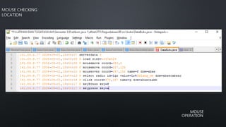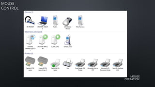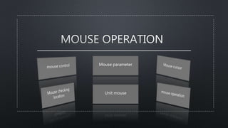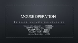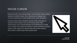 Mouse merupakan perangkat masukan yang digunakan untuk mengontrol komputer. Terdiri dari sensor optik, IC, LED, dan komponen lainnya. Sensor optik mengambil gambar permukaan dan menghitung perubahan posisi untuk menentukan arah gerakan mouse. Komponen elektronik lainnya berfungsi untuk mengatur tegangan, mengirim sinyal ke komputer, dan mendeteksi klik maupun scroll pada mouse.