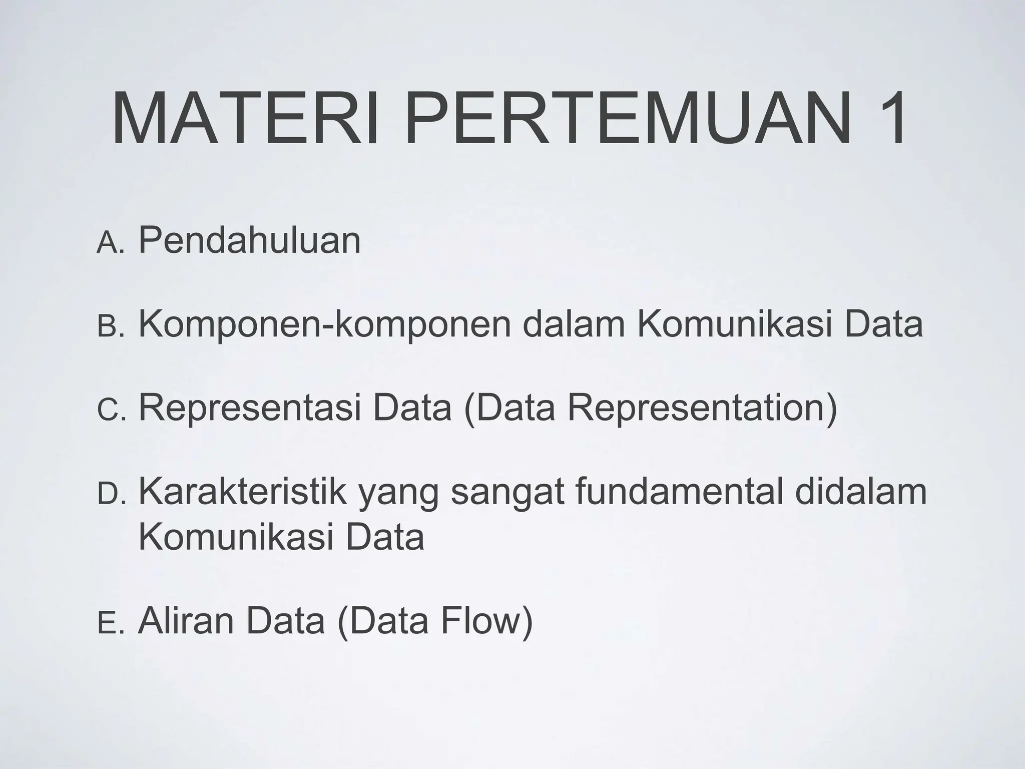 Dokumen ini membahas komunikasi data, termasuk proses pengiriman dan penerimaan informasi antar perangkat. Terdapat lima komponen utama dalam komunikasi data: data, pengirim, penerima, media transmisi, dan protokol, serta berbagai tipe representasi data seperti teks, angka, gambar, audio, dan video. Selain itu, efektivitas sistem komunikasi data dinilai berdasarkan pengiriman, akurasi, ketepatan waktu, dan jitter.