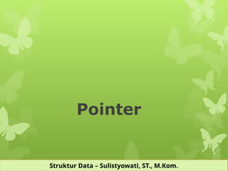 Dokumen ini membahas tentang pointer dalam struktur data, menjelaskan definisi, pernyataan variabel, serta perbedaan antara pointer dan variabel biasa. Pointer adalah variabel yang menyimpan alamat memori dan dapat digunakan dengan operator khusus untuk mengakses dan mengelola data. Contoh implementasi dan operasi yang dapat dilakukan dengan pointer juga disertakan dalam dokumen.