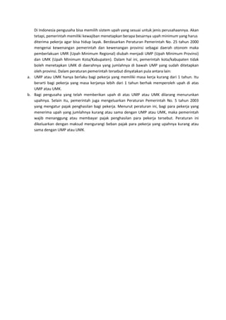 Sistem upah merupakan kompensasi yang diberikan kepada pekerja atas tenaga kerjanya. Ada berbagai sistem upah seperti upah menurut waktu, prestasi, borongan, premi, partisipasi, dan bagi hasil. Pemerintah menetapkan upah minimum regional dan provinsi untuk melindungi hak pekerja mendapatkan penghasilan layak.