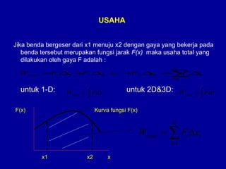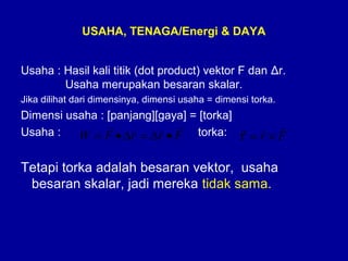 Dokumen tersebut membahas tentang usaha, tenaga, dan daya. Usaha adalah hasil kali vektor gaya dan perpindahan, sedangkan tenaga adalah kemampuan untuk melakukan usaha. Ada dua jenis tenaga yaitu tenaga potensial dan kinetik. Daya adalah laju perubahan tenaga dalam satuan waktu."