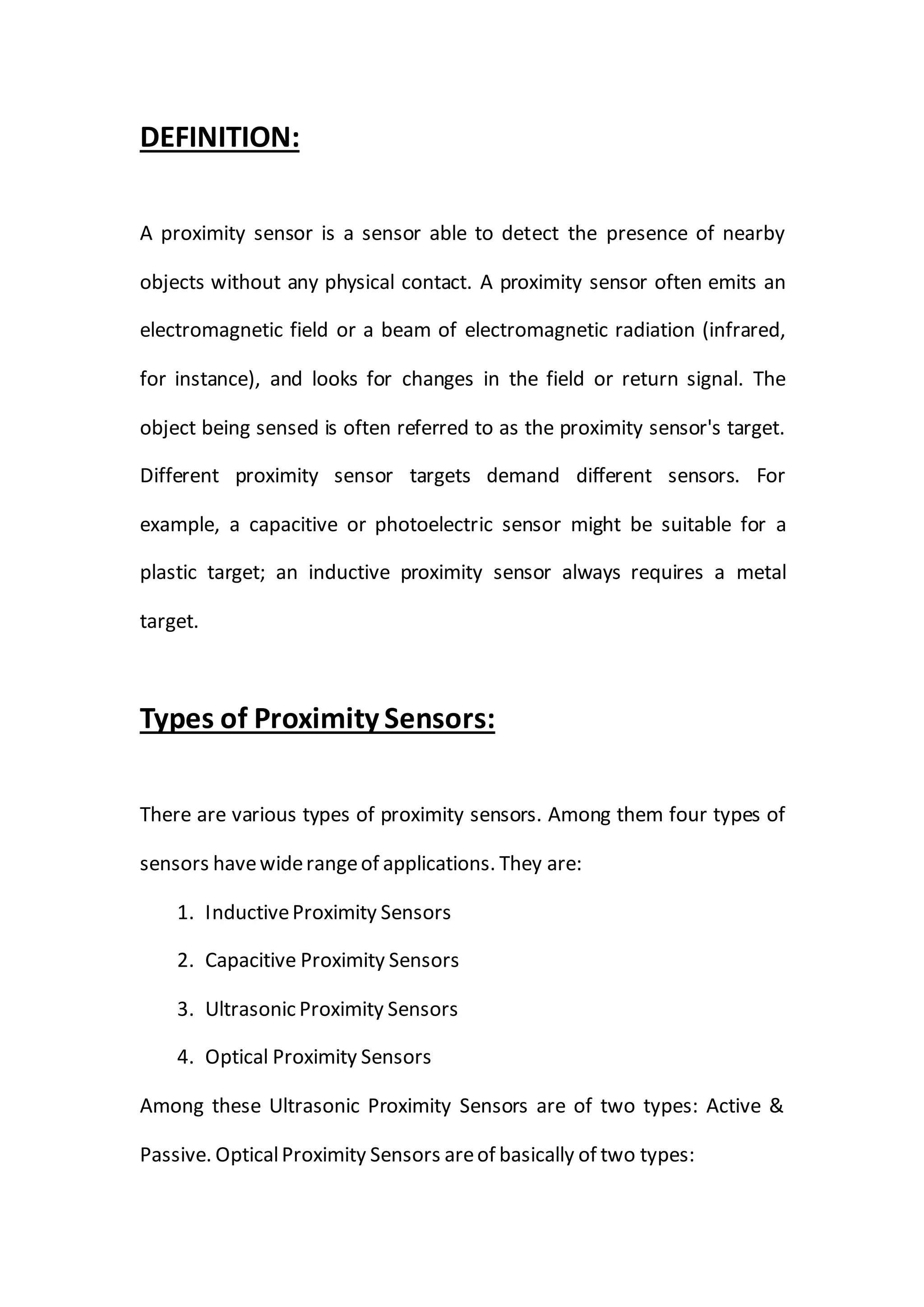 A proximity sensor detects nearby objects without physical contact by emitting electromagnetic fields or beams. There are several types of proximity sensors including inductive, capacitive, ultrasonic, and optical sensors. Inductive sensors detect metal objects using magnetic fields while capacitive sensors can detect both metals and non-metals by measuring capacitance changes. Ultrasonic sensors use sound waves while optical sensors use light beams. Each sensor type has advantages and applications depending on the target object and environmental factors.