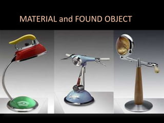 The document discusses different types of materials used in art and design, including their properties and appropriate uses. It covers selecting materials based on intended purpose, ease of use, health hazards, and sustainability considerations. Specific materials discussed include bamboo, new technologies like aerogel, and the use of found objects and readymades in conceptual art. The document emphasizes researching materials and understanding how their intrinsic qualities can enhance a work's meaning.