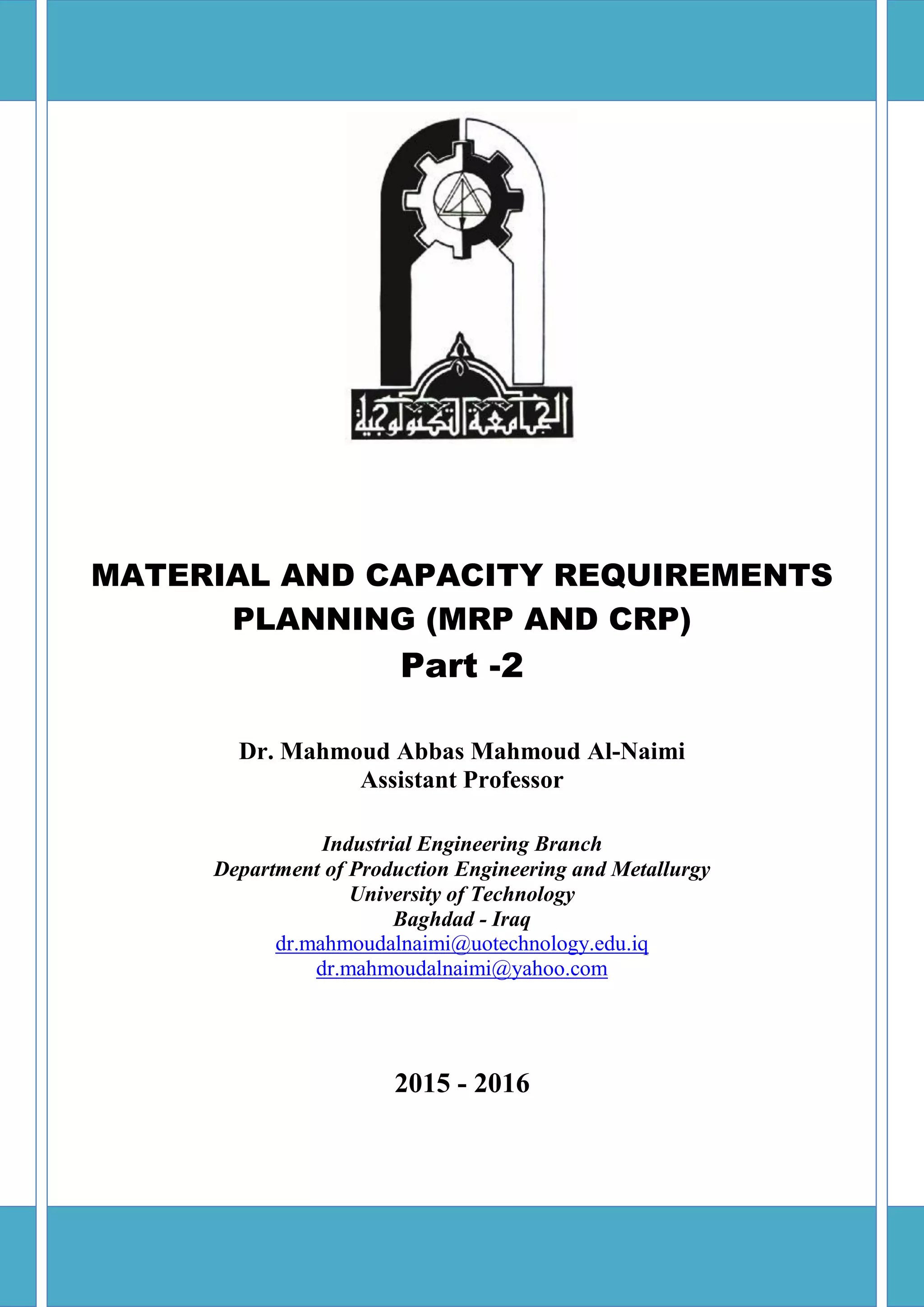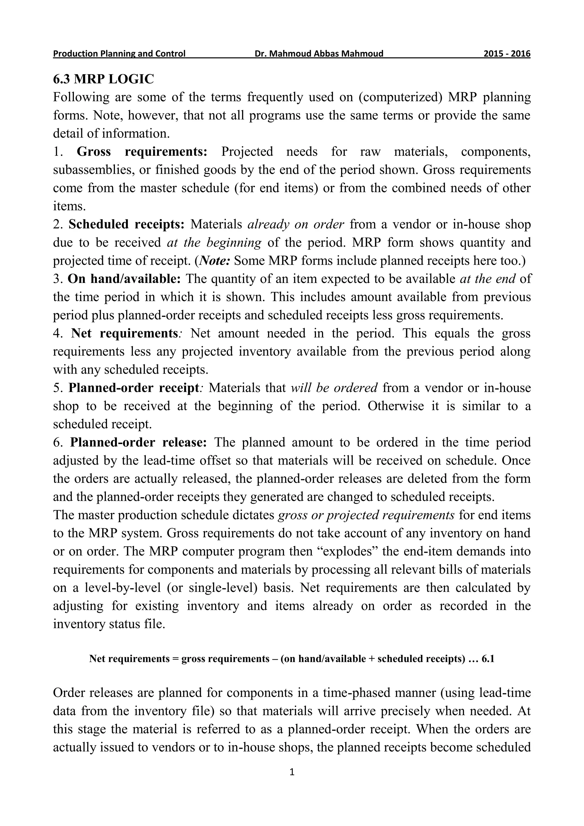 The document discusses Material Requirements Planning (MRP) and Capacity Requirements Planning (CRP), detailing terms and calculations used in MRP systems such as gross requirements, scheduled receipts, available inventory, net requirements, and planned-order receipts. It also covers system refinements, safety stock considerations, lot sizing methods, and the economic order quantity (EOQ) method, emphasizing the importance of accurate inventory management in manufacturing processes. Additionally, it provides practical examples and equations to illustrate MRP concepts and calculations.