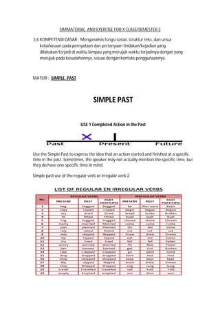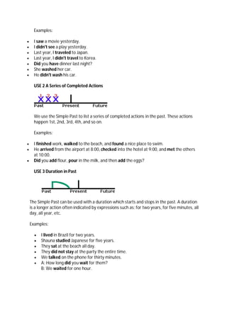 The document discusses the use of the simple past tense in English. It describes four main uses: 1) to express completed actions in the past that occurred at a specific time, 2) to list a series of completed past actions, 3) to describe actions that occurred for a period of time in the past, and 4) to talk about habitual past actions or habits that have stopped. Examples are provided to illustrate each use of the simple past, such as "I saw a movie yesterday" and "I lived in Brazil for two years."