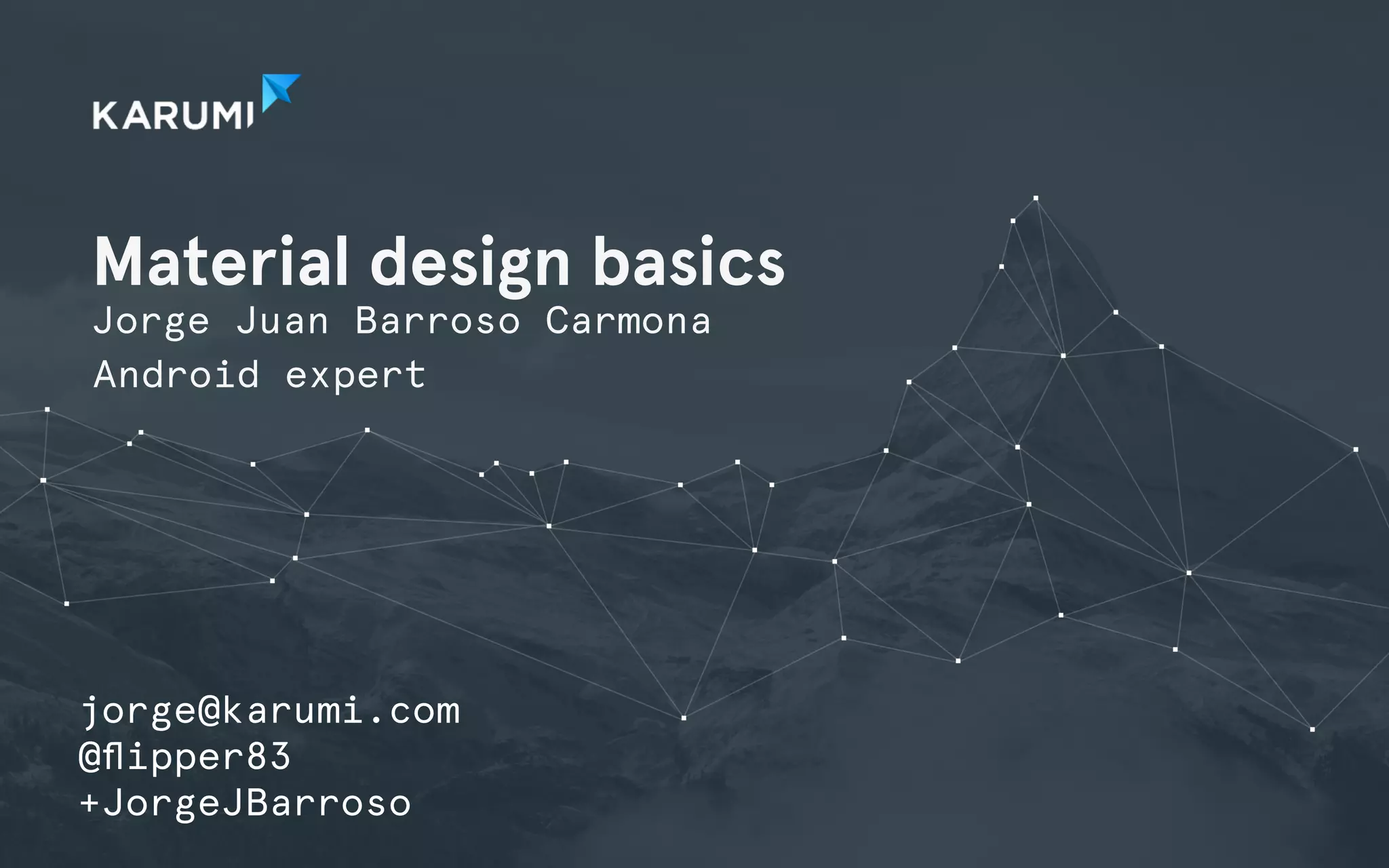 This document discusses material design basics for Android, including principles like depth, reactions, outlines, themes, palettes, typography, cards, toolbars, activity transitions, element transitions, ripples, and circular reveal animations. It provides code examples and references additional resources on the topic. The presenter, Jorge Juan Barroso Carmona, works at Karumi, an Android development studio, and encourages attendees to contact him with any other questions.
