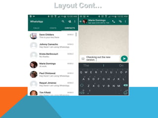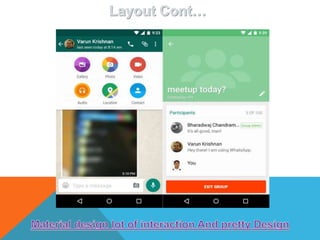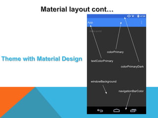 Material design is a design language developed by Google to simplify Android app design. It utilizes grid-based layouts, responsive animations and transitions, padding, and depth effects like lighting and shadows. Material design components are like materials in that they can change shape/size but have no dimension, and inputs cannot pass through them. Material design provides advantages like being easy to implement, attractive, supporting communication between activities/data, and easy theme creation through multiple available layouts.