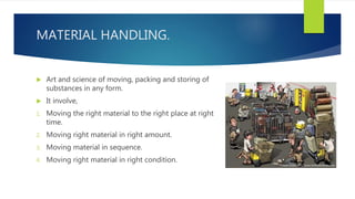 This document discusses material handling, which involves the movement, storage, and protection of materials. It describes the functions of material handling as lowering costs, reducing cycle times, and improving productivity and storage capacity. The principles of material handling emphasize planning, standardization, and ergonomics. Material handling can be manual, automated, or semi-automated. Key factors that influence material handling include production needs, equipment capabilities, and human elements. Common equipment includes conveyors, cranes, industrial vehicles, and auxiliary devices.