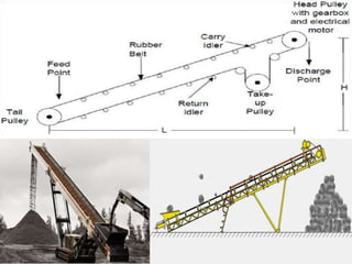 Material handling equipment includes conveyors, hoists, cranes, forklifts and bulldozers used to transport materials within manufacturing and construction processes. Conveyors efficiently move heavy and bulky items on production lines. Hoists use pulleys and chains to lift equipment, while cranes use booms and jibs to move loads horizontally and vertically. Forklifts self-load and unload trucks. Bulldozers prepare construction sites by clearing land and leveling earth using their large blades.