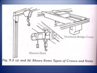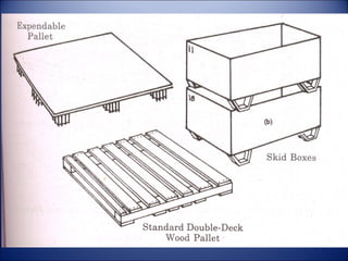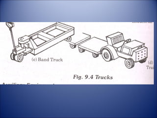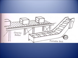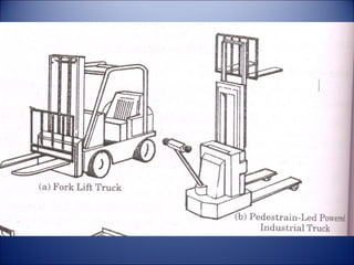 Material handling involves the movement, storage, and protection of materials. The main objectives are to reduce costs by minimizing handling distances and the number of times materials are handled. An efficient material handling system contributes to lower costs, higher productivity, and improved safety and quality. Factors such as production needs, material characteristics, and available equipment influence the selection of appropriate material handling methods and equipment.