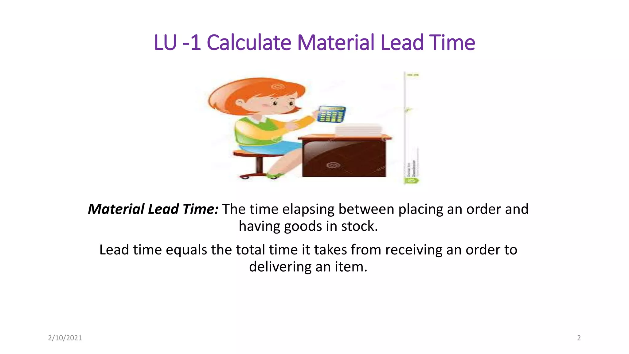The document discusses various types of lead times including material, production, and customer lead times. It provides examples of how to calculate material and process lead times, and strategies for reducing lead times such as using domestic suppliers, increasing order frequency, and consolidating suppliers. The document also includes a template for creating a time and action plan to help ensure orders are delivered within lead times.