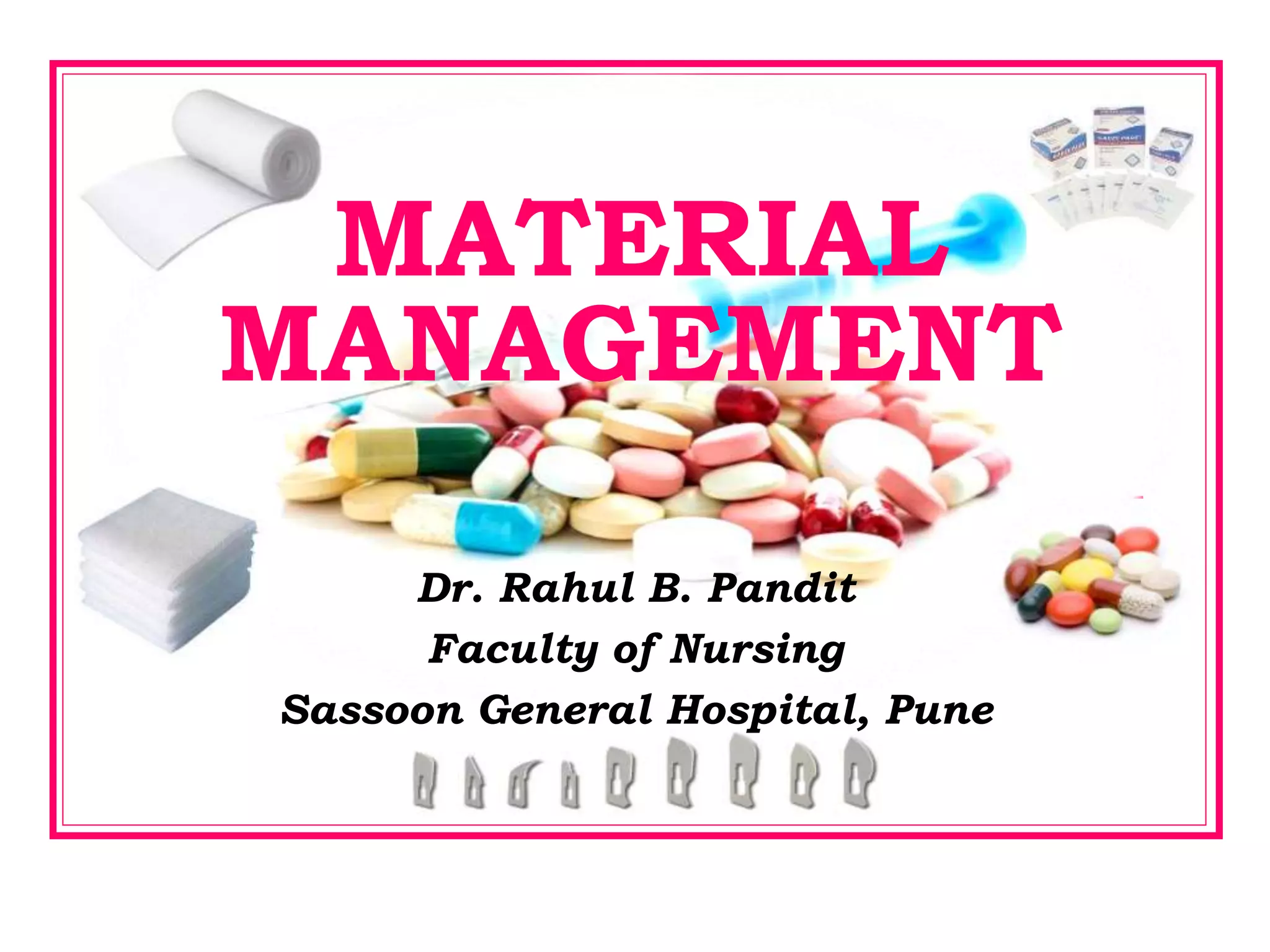 This document defines material management as planning, organizing, and controlling aspects involved in ensuring the availability of necessary materials, supplies, drugs, and equipment as needed. The purpose of material management is to provide the right materials in the required quantity and quality when required, cut costs through standardization, develop healthcare knowledge and skills, and increase healthcare system efficiency. Nurses play an important role in material management by ensuring adequate supplies, monitoring quality and safety, maintaining inventory and emergency stocks, and participating in policymaking and evaluation.