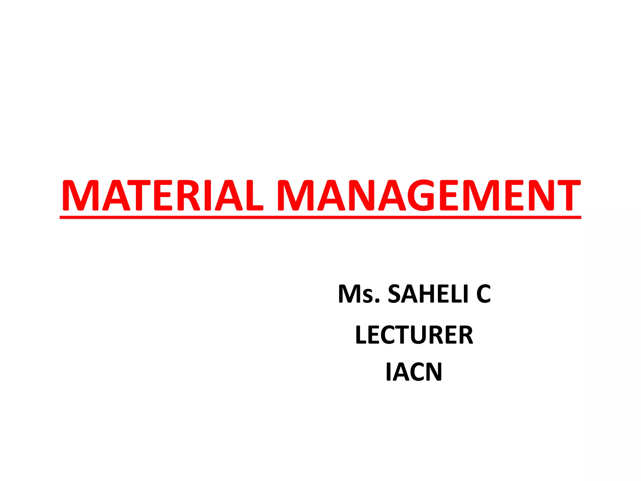 The document discusses material management in healthcare. It defines material management as the planning, organizing, and control of materials from initial purchase through final use. Material management aims to ensure a continuous supply of materials needed for patient care at the right price through processes like demand estimation, procurement, storage, and maintenance. It integrates functions like purchasing, inventory control, and disposal to efficiently manage over 40% of healthcare funds spent on materials.