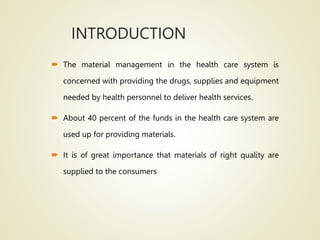 The document discusses the critical role of material management in healthcare, which involves planning, organizing, and controlling the supply of drugs, equipment, and supplies essential for effective health service delivery. It outlines the types of materials, objectives, and principles of material management, including the need for quality, quantity, and timely provision of materials. Additionally, it details procedural steps such as demand estimation, procurement, inspection, inventory control, and distribution to ensure smooth operations in healthcare facilities.