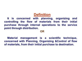 Material management involves planning, organizing, and controlling the flow of materials from purchase to distribution. Its aims are to obtain the right quality and quantity of supplies at the right time, place, and cost. Key objectives include obtaining the lowest prices, minimizing inventory levels, and operating efficiently. Effective material management requires classifying items using various analyses to determine appropriate inventory controls and safety stock levels based on factors like cost, criticality, usage, and availability. Proper storage, ordering, and disposal procedures help ensure an organization has needed materials while minimizing costs and waste.