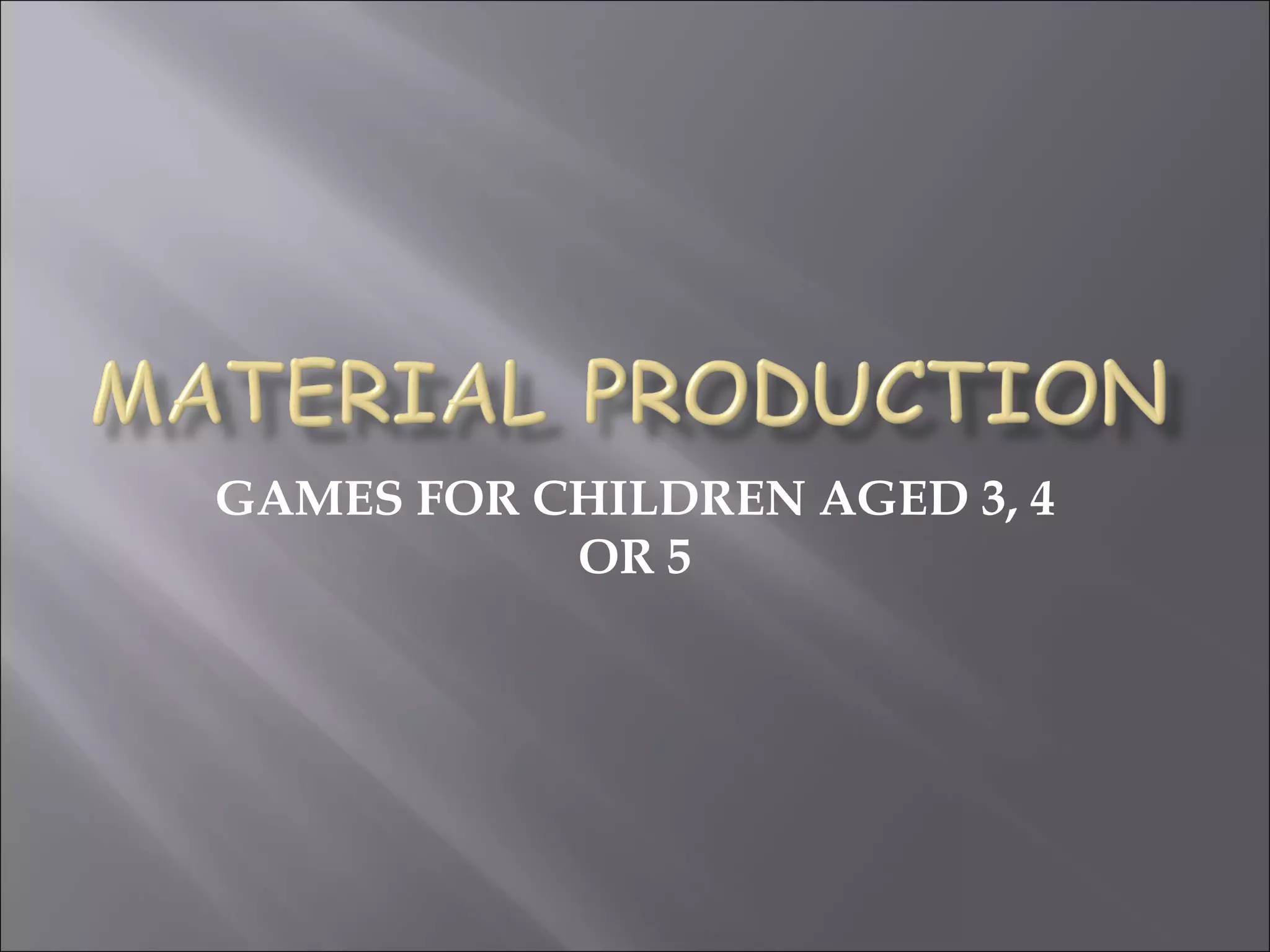 The document provides descriptions of games and activities for teaching English to children aged 3 to 5. It discusses using games to develop oral comprehension, vocabulary, and motor skills. Examples of games described include using flashcards, singing songs with instruments, simulating eating food to guess vocabulary, and passing balloons in a circle. The goal is to make learning enjoyable and develop English skills through play.