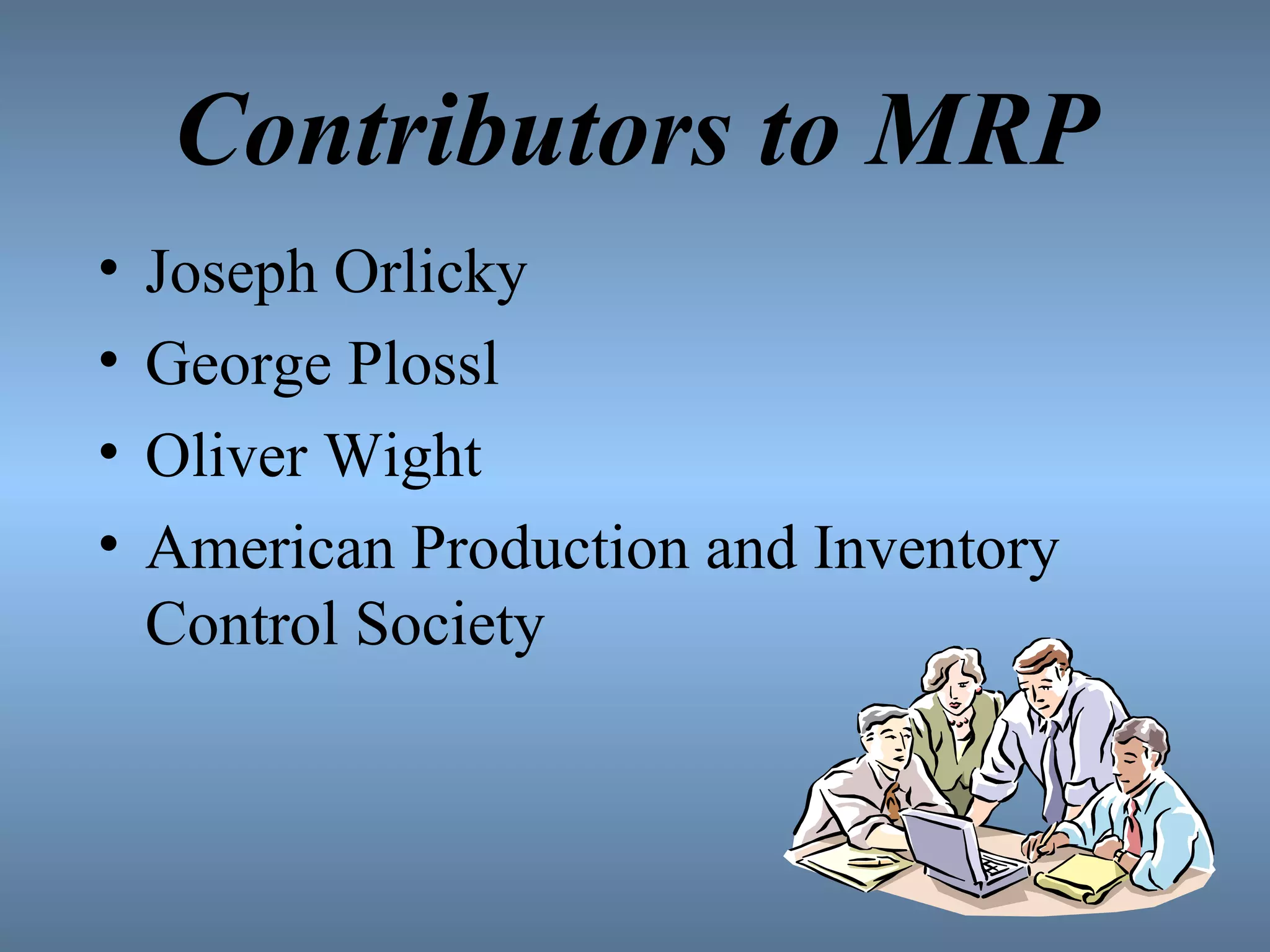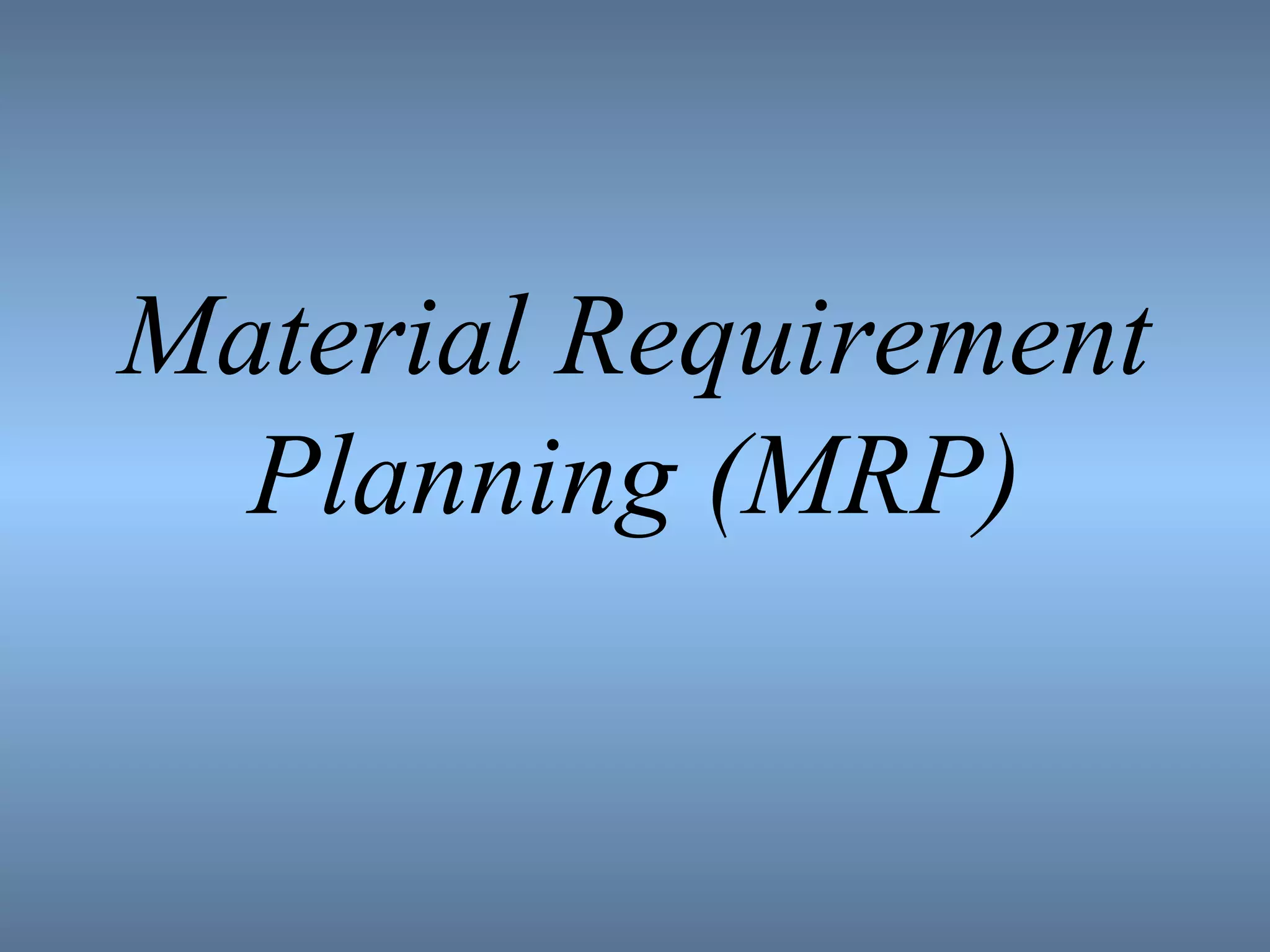 Material Requirement Planning (MRP) is a computerized inventory control and production planning system that schedules component items as needed to track inventory and help companies in many aspects. MRP takes inputs like the bill of materials, master production schedule, and inventory levels to generate outputs like manufacturing and purchasing orders through a process using an MRP matrix. It aims to reduce costs and improve operations by ensuring the right materials are available at the right time. MRP was later expanded to MRP II which additionally incorporates things like financial planning and capacity requirements.