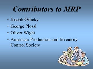 MRP is a computerized inventory control and production planning system that schedules component items as needed. It tracks inventory and helps companies in many aspects of business, such as reducing inventory levels and improving customer service. MRP takes inputs like a product structure file and master production schedule to output manufacturing and purchasing orders. It works by identifying material requirements through a multi-step process of gross requirements, scheduled receipts, and planned order releases. An example case showed how MRP helped a lighting manufacturer improve on-time order completion from less than 75% to 97%.