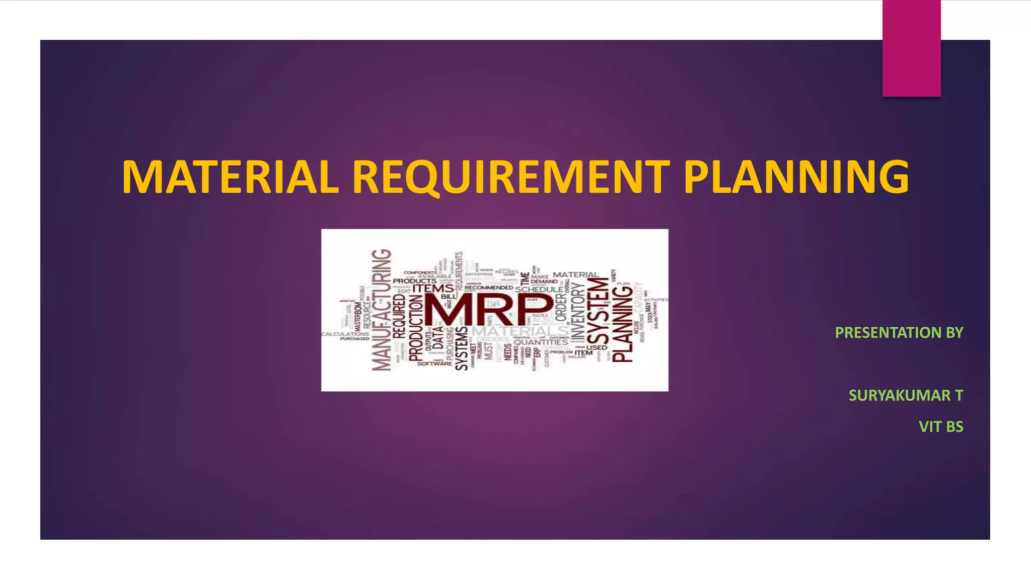 Material Requirement Planning (MRP) is a time-phased priority-planning technique developed by Joseph Orlicky in 1964 for managing manufacturing processes, scheduling supply, and controlling inventory. It involves managing orders based on independent and dependent demands to ensure material availability while minimizing excess. MRP systems vary in implementation levels (A to D) and can help forecast materials, reduce waste, and improve production efficiency, though they may suffer from inaccuracies and setup costs.