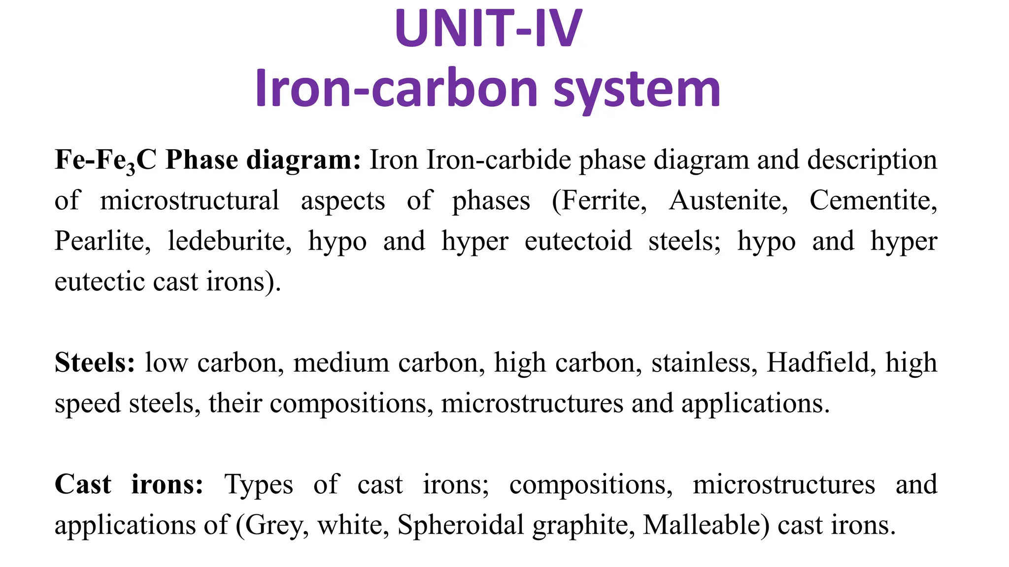 Pearlite, ledeburite, hypo and hyper eutectoid steels; hypo and hyper