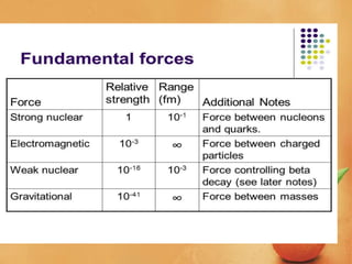 The document discusses magnetism and magnetic materials. It describes the four fundamental forces - strong nuclear, electromagnetic, weak nuclear, and gravitational. It explains that the electromagnetic force causes electric and magnetic effects and is responsible for interactions between magnets. It also notes that different materials exhibit different types of magnetic ordering, including diamagnetism, paramagnetism, ferromagnetism, ferrimagnetism, and antiferromagnetism. The document also discusses topics like magnetic domains, hysteresis curves, and applications of magnetism like tape recording and hard disks.