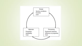 The document outlines the material selection process in engineering, emphasizing criteria such as performance characteristics, processing capabilities, environmental impact, and cost considerations. It provides an example related to automotive exhaust systems and highlights the importance of various materials based on specific mechanical properties and tolerances. Additionally, it discusses engineering standards and codes as essential tools for ensuring safety, compatibility, and effective communication across the industry.