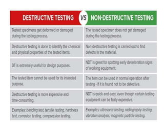 This document discusses material testing methods for construction materials. It describes both destructive and non-destructive testing methods. Destructive methods like tensile, compression, and hardness tests are used to determine properties like strength and flexibility. Non-destructive methods like ultrasonic, magnetic particle, and dye penetrant tests can find internal and surface flaws without damaging the material. Proper material testing is important to ensure construction materials can withstand forces and provide long-lasting, safe structures.
