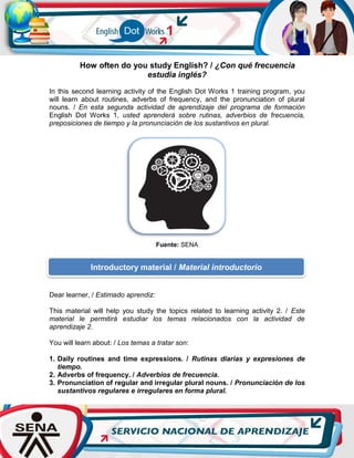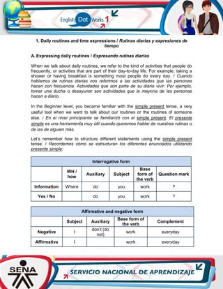 The document outlines an English learning activity focused on routines, adverbs of frequency, and pronunciation of plural nouns. It provides instructional material on daily activities, time expressions, frequency adverbs, and the pronunciation rules for both regular and irregular plural nouns. Additionally, it includes an example of a daily routine and an exercise for learners to assess comprehension.