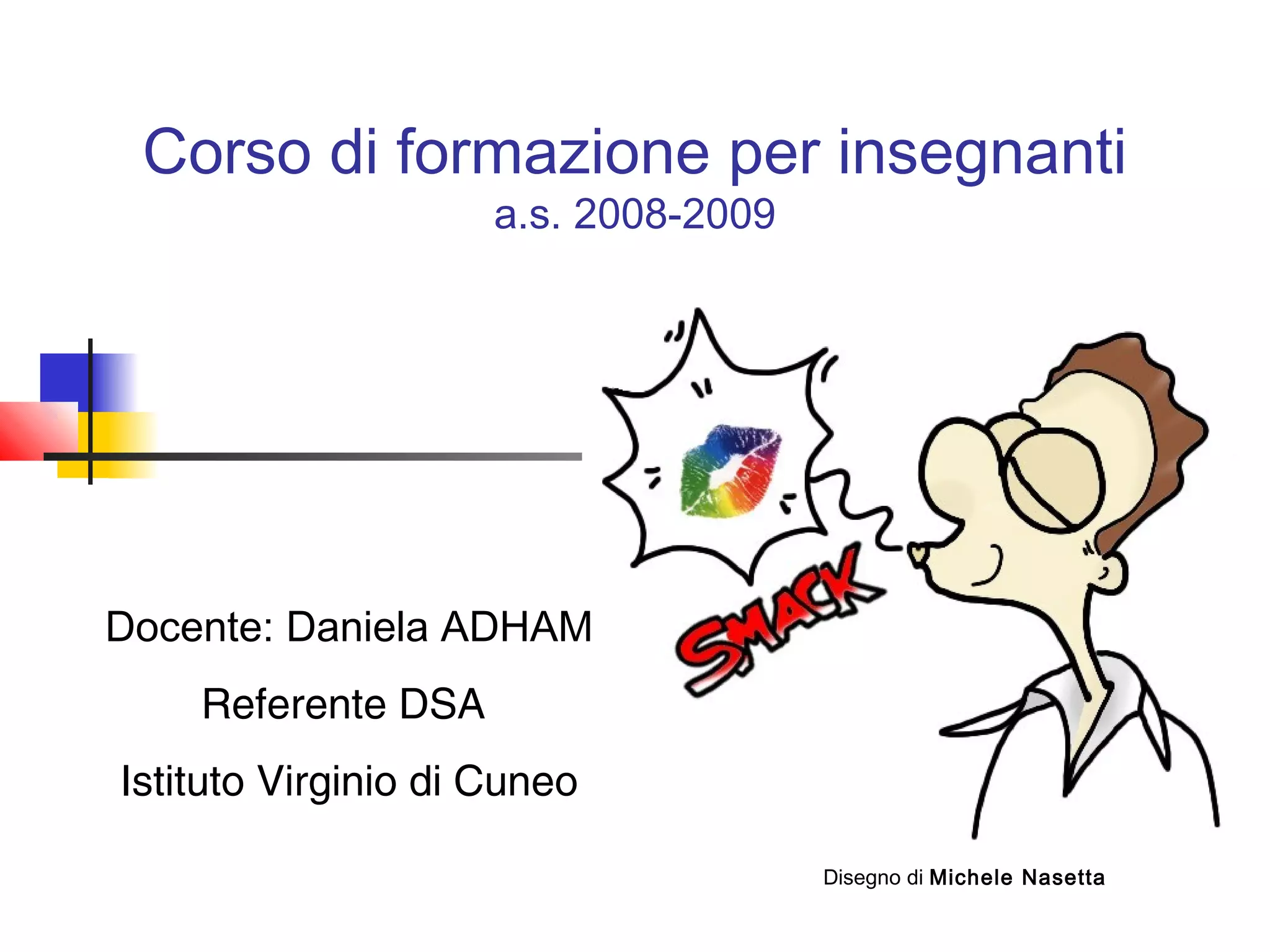 Il documento tratta del corso di formazione per insegnanti sulla gestione delle difficoltà di apprendimento, in particolare la dislessia e i disturbi specifici di apprendimento (DSA). Vengono descritte le caratteristiche e le cause di questi disturbi, nonché le strategie didattiche e gli strumenti compensativi e dispensativi utili per supportare gli studenti. Infine, si enfatizza l'importanza di un approccio educativo flessibile e personalizzato per favorire l'apprendimento degli alunni con DSA.