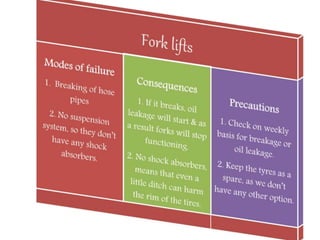 Material handling involves moving, storing, protecting and controlling materials. It includes various types of equipment like conveyors, industrial vehicles, hoists, forklifts and stackers. Proper planning, standardization, ergonomics, unit load design, space utilization, automation and life cycle costing are important principles of material handling. Questions around what, where, when, how, who and which materials and equipment should be considered to design an effective material handling system. Regular maintenance, safety training and use of personal protective equipment are crucial to safely operate material handling equipment.