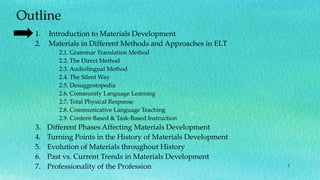 The document provides a comprehensive historical overview of materials development in English Language Teaching (ELT), categorizing different methods and approaches such as the Grammar Translation Method, Direct Method, Audiolingual Method, and more. It discusses the evolution, phases, and turning points that have influenced materials development, as well as the types of materials utilized in these approaches. The document emphasizes the importance of both printed and non-printed materials, highlighting the professionality of the field and current trends.