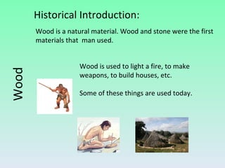 The document summarizes information about wood, including its properties, uses, and processing. It discusses how wood is obtained from trees and processed. Key steps include felling trees, removing branches and bark, cutting the wood, and drying it. Wood has properties like being hygroscopic, a poor conductor of heat and electricity, and varying in hardness between species. Derivatives like plywood, chipboard, and fiberboard are also mentioned. Common woodworking tools are outlined for cutting, fixing, measuring, smoothing, drilling, splitting, and finishing wood.