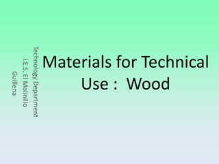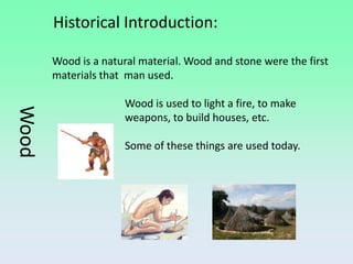 Wood is a natural material that was one of the first used by humans. Trees are cut down and processed to extract wood, which is then cut, dried, and distributed. There are different types of wood including softwoods and hardwoods. Wood can also be processed into wood derivatives like plywood, chipboard, and paper. Woodworking involves measuring, marking, cutting, drilling, smoothing, and finishing wood using both hand tools and power tools.