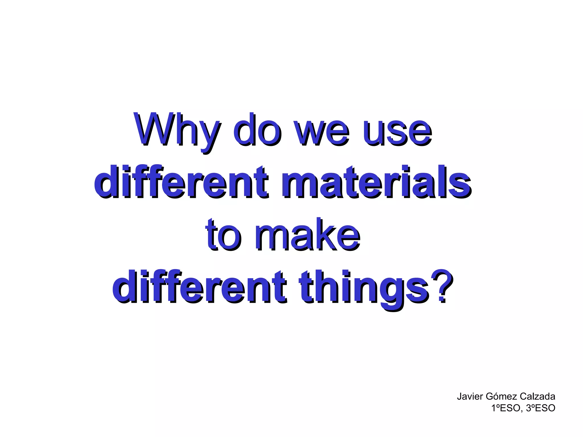 The document discusses why different materials are used to make different objects and lists some important material properties. It asks which materials would be suitable for making a chair, book, and wire jacket based on factors like strength, price, appearance, and environmental impact. Some key material properties listed include color, weight, hardness, flexibility, conductivity, transparency, and resistance to heat, corrosion, and humidity.