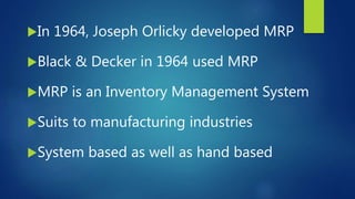 MRP is a materials requirements planning system developed in 1964 to help manufacturing companies manage inventory. It uses a master production schedule, bill of materials, and inventory records as inputs to determine when to release new orders and reschedule open orders. The objectives of MRP are to ensure materials and products are available when needed, maintain low inventory levels, and plan manufacturing, delivery, and purchasing activities. It operates by processing input files through the MRP system to generate outputs like planned order schedules. Potential issues include lot sizing, safety stock, scrap allowance, and updating inaccurate files.