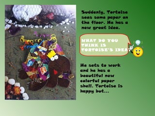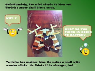 Tortoise has a series of unsuccessful attempts at making new shells after finding paper on the ground. His paper shell blows away in the wind. His wooden shell burns near a fire. His wool shell unravels after getting caught on a rose bush. He decides his final shell will be made of rubber and plastic, materials that are hard, waterproof, and won't burn or unravel like the previous shells.