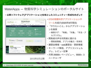 This document introduces MateriApps LIVE!, a virtual machine-based live Linux distribution containing materials science software. It provides over 20 software packages for computational materials science and visualization tools. MateriApps LIVE! allows users to access these software packages without installation through a web browser-based interface or by running the virtual machine on their own computer using VirtualBox. The document provides instructions for downloading and running MateriApps LIVE! in VirtualBox on Windows, Mac, and Linux systems.