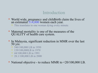 Maternal mortality remains a significant issue worldwide, with over 500,000 deaths annually. Through initiatives like the Confidential Enquiries into Maternal Deaths system, Malaysia has significantly reduced its maternal mortality rate from 540/100,000 live births in 1950 to 28.1/100,000 in 2000. Postpartum hemorrhage is a leading cause of death in Malaysia, while medical conditions, sepsis, and hypertensive disorders also contribute substantially. Recommendations focus on increasing access to emergency care and transportation, improving provider training, and expanding family planning programs.