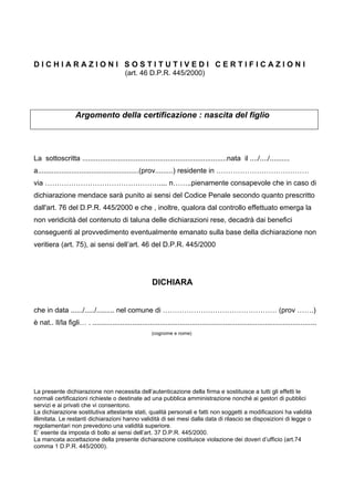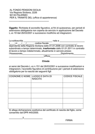 La richiedente, dipendente della regione siciliana dal 2006, richiede l'accredito figurativo di contribuzione per astensione obbligatoria per la nascita dei suoi figli, in conformità al decreto legislativo 151 del 26 marzo 2001. In allegato, viene presentata una dichiarazione sostitutiva del certificato di nascita, consapevole delle conseguenze di eventuali dichiarazioni mendaci. La dichiarazione è esente da imposta di bollo e ha validità illimitata per attestare stati e qualità personali.
