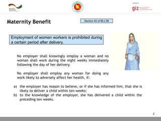 The document outlines the regulations surrounding maternity benefits for women employed in establishments, including a prohibition on working for eight weeks post-delivery and eligibility criteria for receiving maternity benefits. It details the procedures for notifying employers, calculation methods for determining benefit amounts, and the responsibilities of female workers to ensure compliance. Failure to provide maternity benefits can lead to significant financial and health repercussions for workers, as well as legal violations for employers.