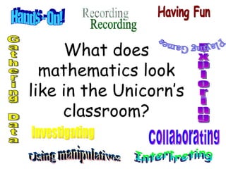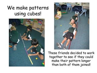 The document describes a hands-on mathematics classroom where students collaborate to investigate patterns, measure each other's heights, collect and record data, and make estimates using manipulatives. Students work together to extend patterns using cubes, measure and compare heights, gather data on classmate heights and record it, and estimate lengths using hands and pencils before checking with objects.