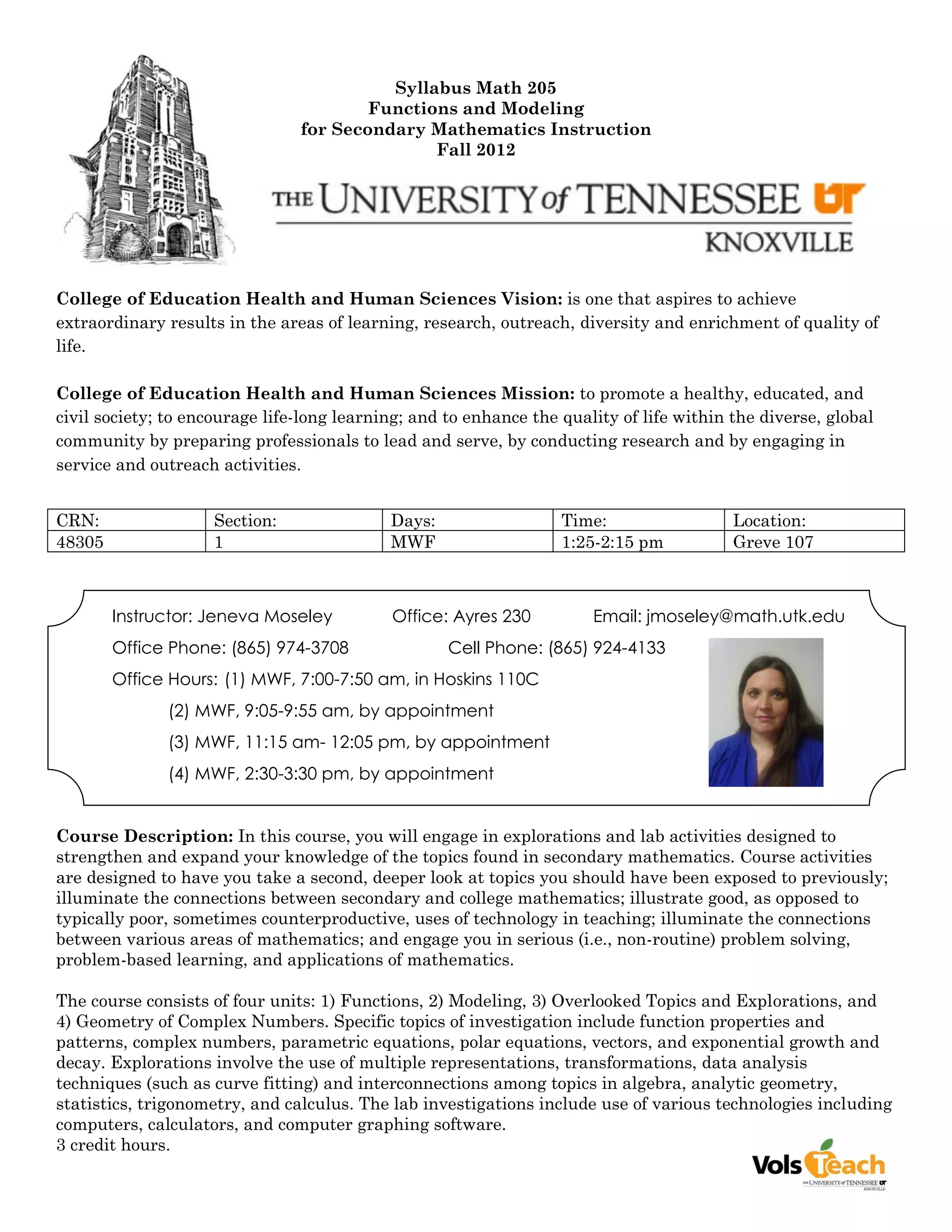 This syllabus outlines the course Math 205 Functions and Modeling for Secondary Mathematics Instruction which covers topics including functions, modeling, complex numbers, and geometry through classroom activities, labs, homework, and 4 exams. The course aims to strengthen students' content knowledge of secondary math topics and demonstrate proficiency with technology in the mathematics classroom. Grades are determined by tests, assignments, labs, participation, a midterm project, and a final exam comprehensive of the semester's material.