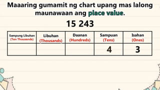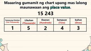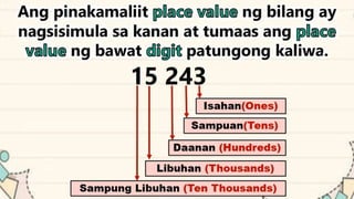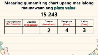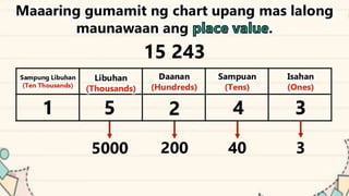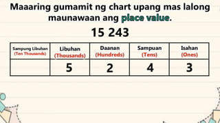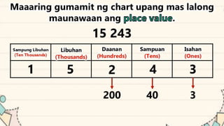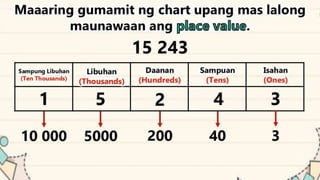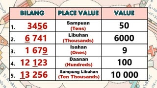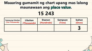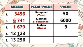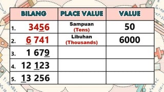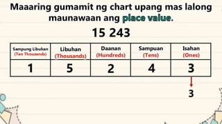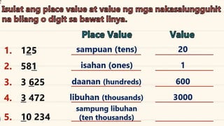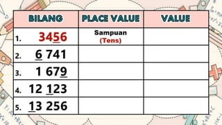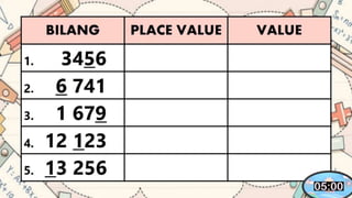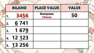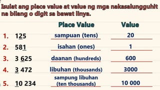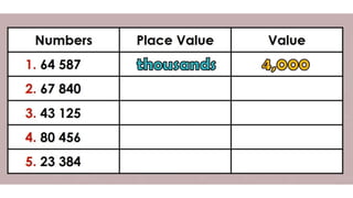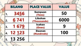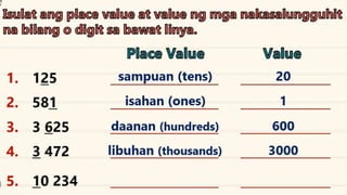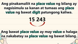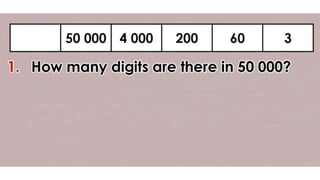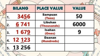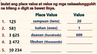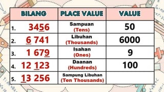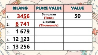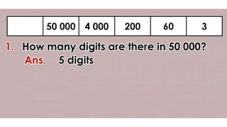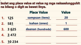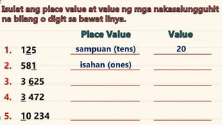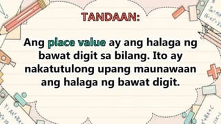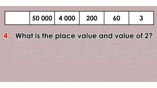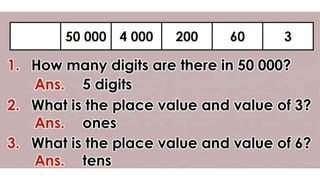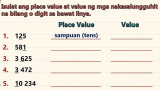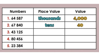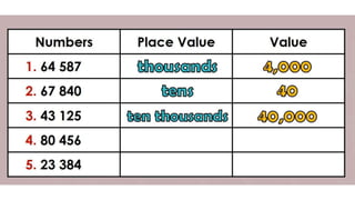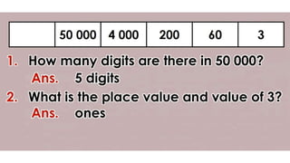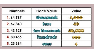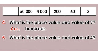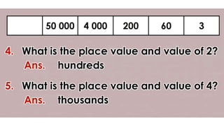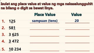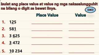 This document discusses place value and how the value of each digit in a number depends on its position. It defines place value as the worth of a digit based on its place in a number. Examples are given to illustrate how the same digit, like 5, can have different values depending on if it is in the ones, tens, hundreds, etc. place. Place value charts are introduced to help visualize numbers and identify the correct positional value of each digit. Several examples are provided of writing out numbers in place value chart form. Students are then asked to identify the place value and value of underlined digits in various numbers.