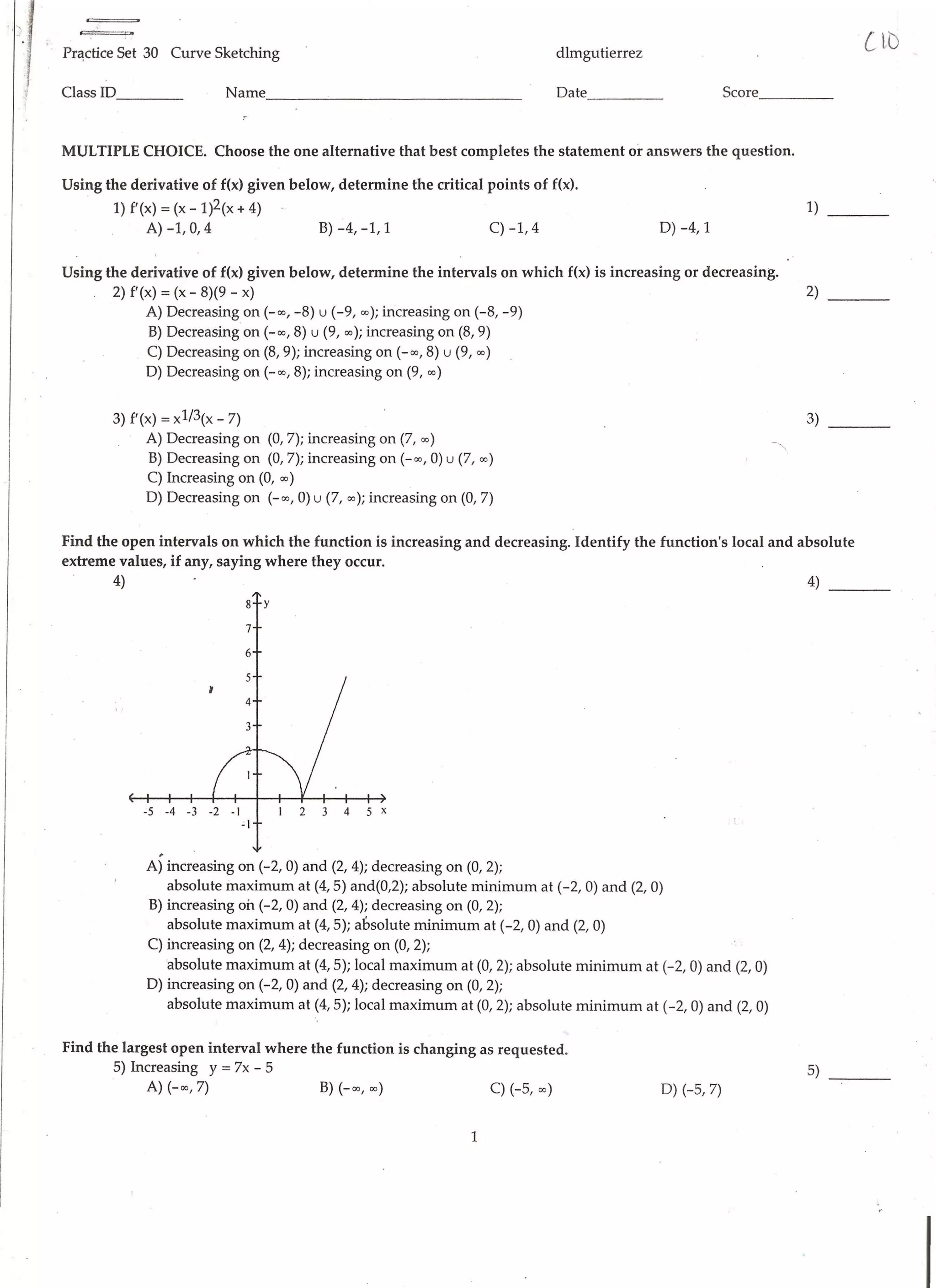 This document contains a practice set of multiple choice questions related to curve sketching and analyzing functions based on their derivatives. There are questions about determining critical points, intervals of increasing/decreasing behavior, locating extrema, and classifying concavity. The document tests skills in analyzing functions through their derivatives to sketch curves and determine properties of the functions.
