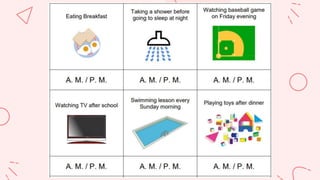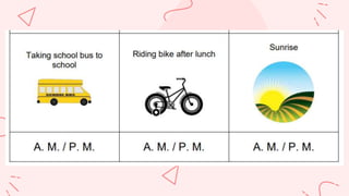 This document discusses measuring time and reading clocks. It explains that minutes and hours are used to measure time, with each clock minute represented by a small division around the clock face. AM is used for morning times from 12:00 AM to 11:59 AM, while PM is used for afternoons and evenings from 12:01 PM to 11:59 PM. Digital and analog clocks are introduced, along with ways to describe times like "quarter to/past" and reading an analog clock face by counting clock minutes. Examples of writing times for both digital and analog clocks are provided.